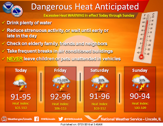 Hot and humid weather is expected to stick around in Illinois. For a large portion of the state, an “excessive heat warning” remains in effect until Sunday evening. Forecasters say temps could jump into the mid-90s today. With the heat index, it could feel like 110-degrees.