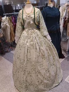 “It’s from a British dress pattern book by a woman named Janet Arnold,” Richardson said. “The original dress dates from about 1860, 1861. It is in its original size. The pattern book is in one-eighth of an inch grid. And you take the grid and you draw it up to one inch on patterning material and you cut it out and this is what you get.” It has a hoop. It has an underskirt and an overskirt. The one thing you will notice about the shape, unlike in Hollywood movies, in women in hoop dresses they are always triangular. The real ones were always shaped like a bell, as is this one.”